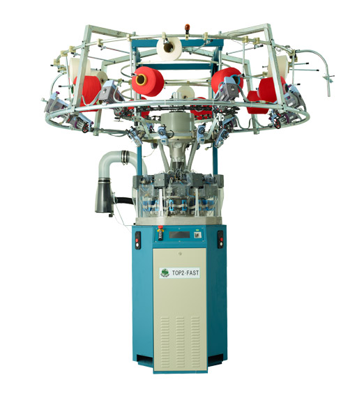 高效8路單面電子提花針織圓機,每路2個選針點,具三功位編織技術(配置16只選針器)。